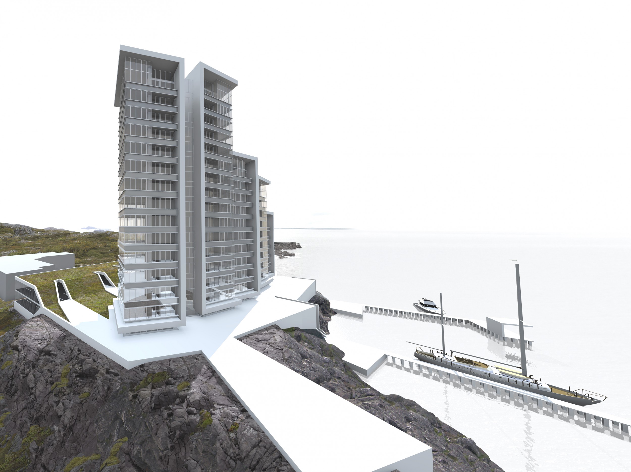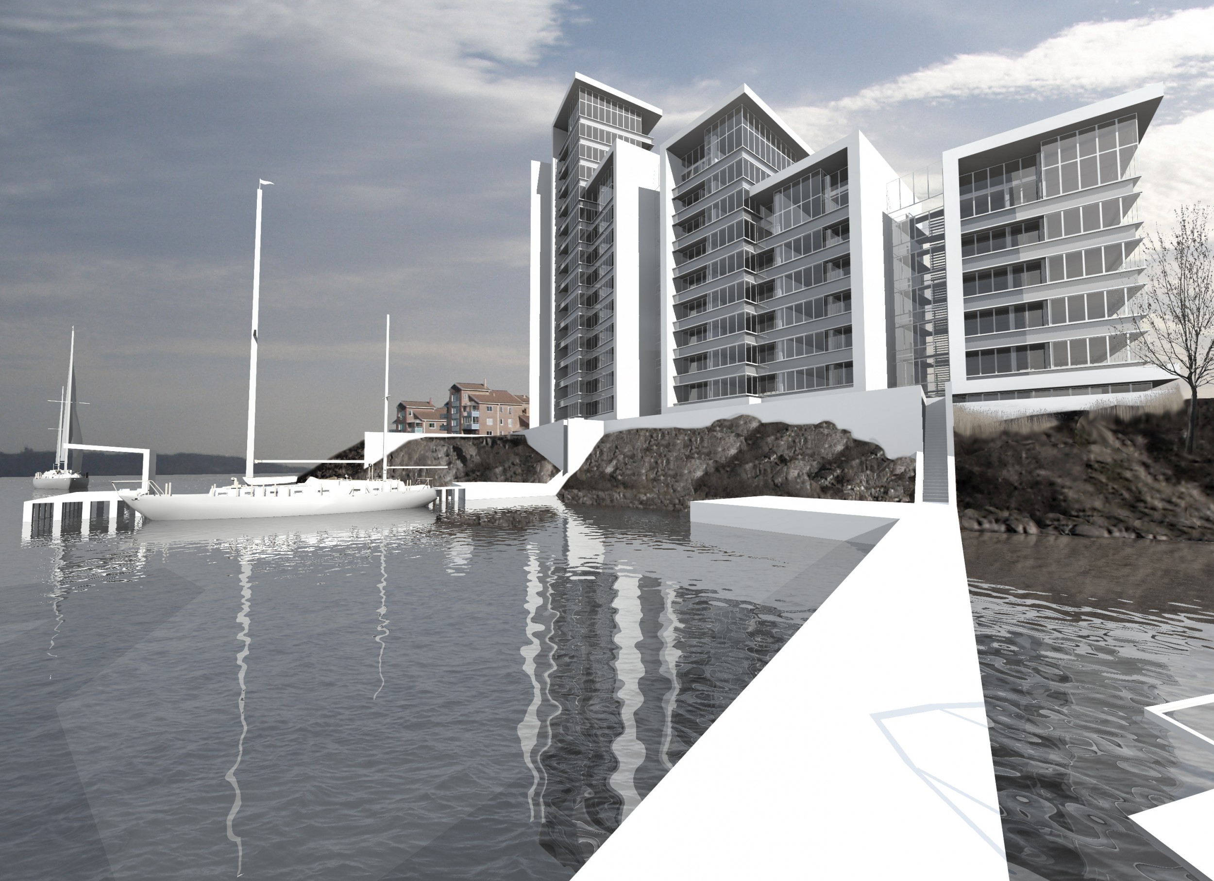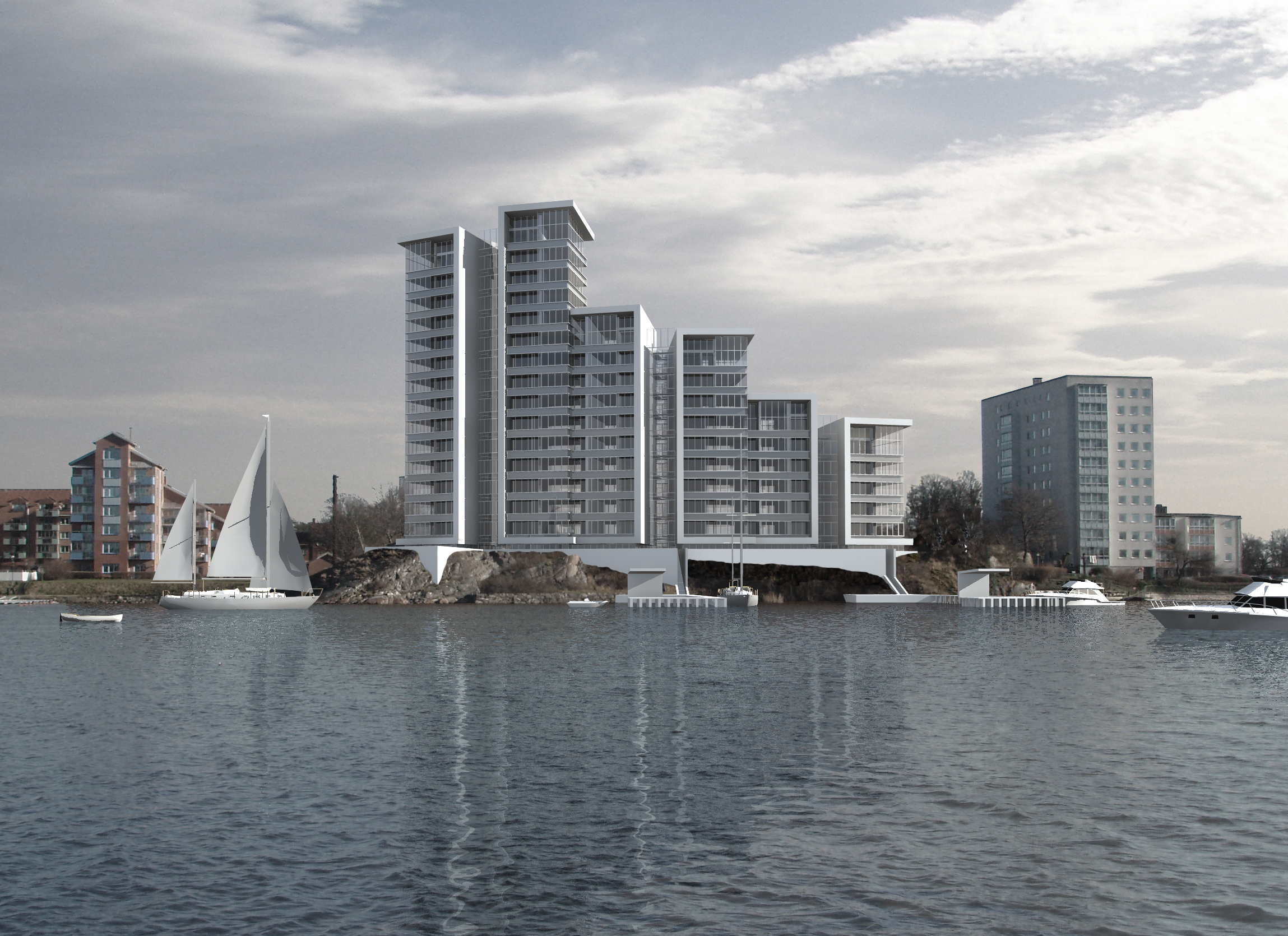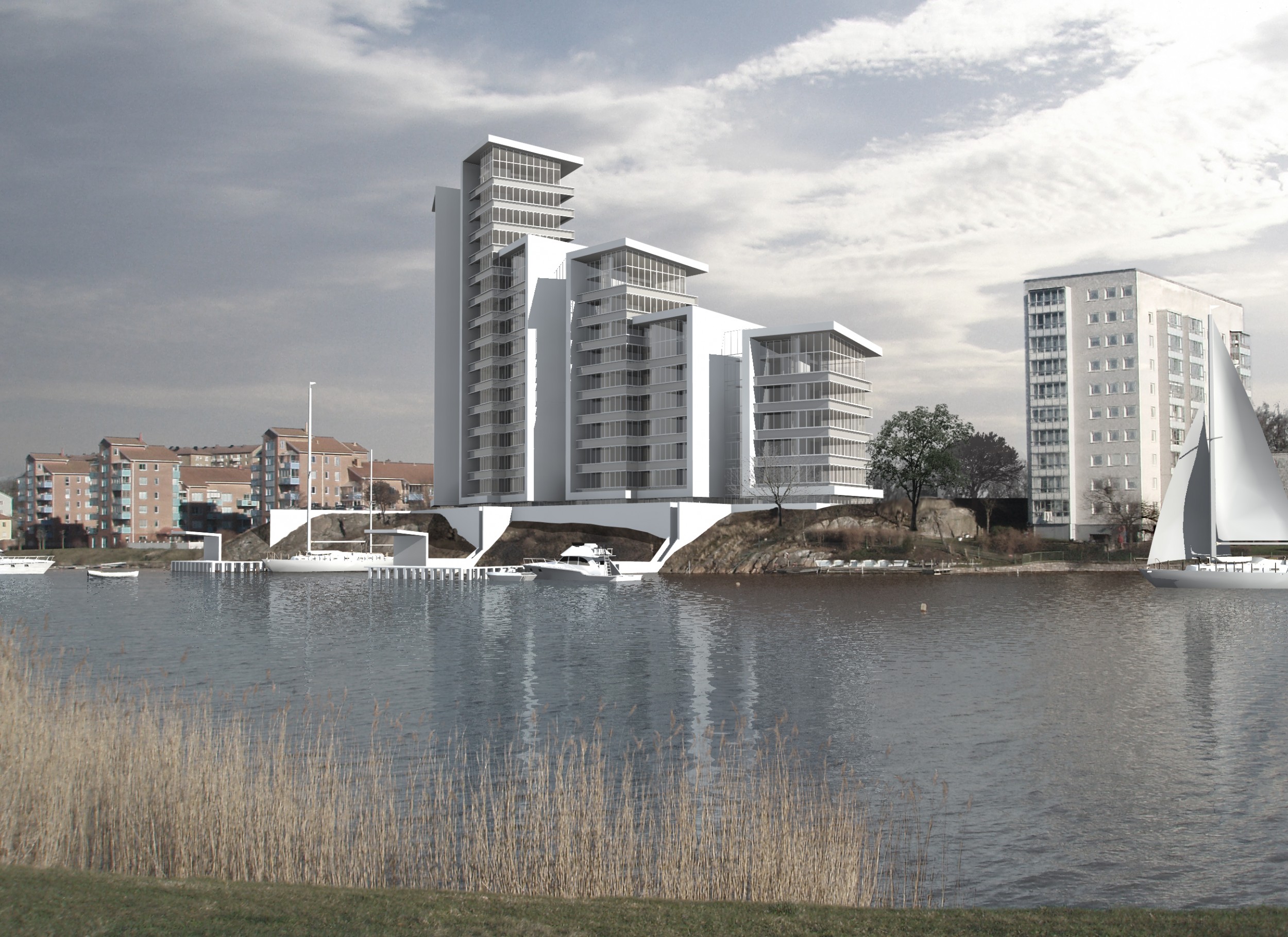 Seks højhuse på kanten af skærgården i Karlskrona. 65 attraktive boliger alle med adgang til lystbådeanlæg.