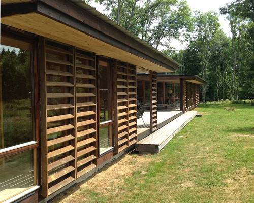 Glasfacaderne kan skærmes af med løse trælameller, hvis det ønskes.