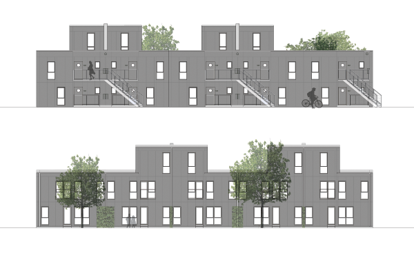 Boligbebyggelsen består af 66 lavenergi boliger fordelt i otte boligstokke. Hver stok er sammensat af præfabrikerede volumener opført i 1, 2 og 3 etager.