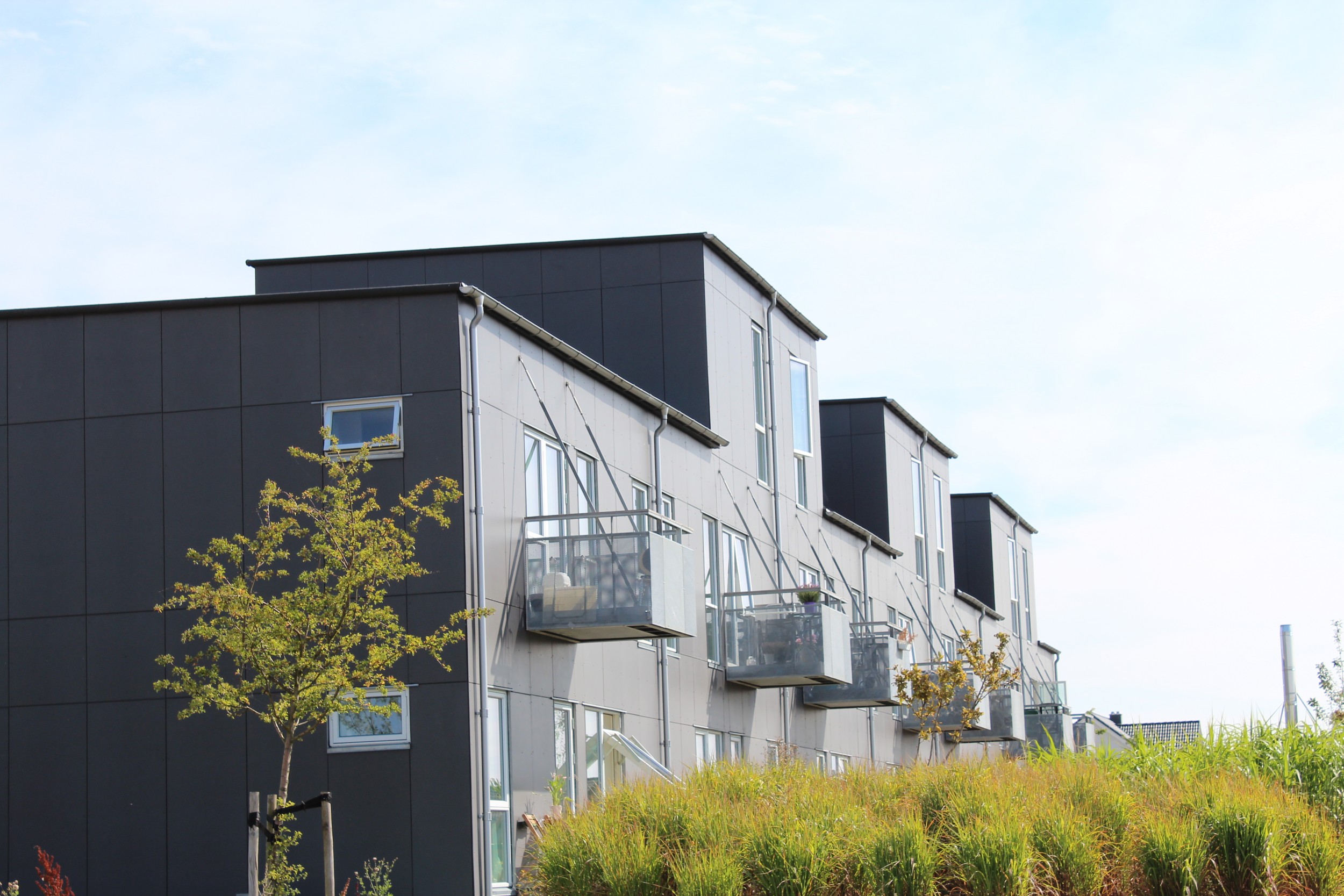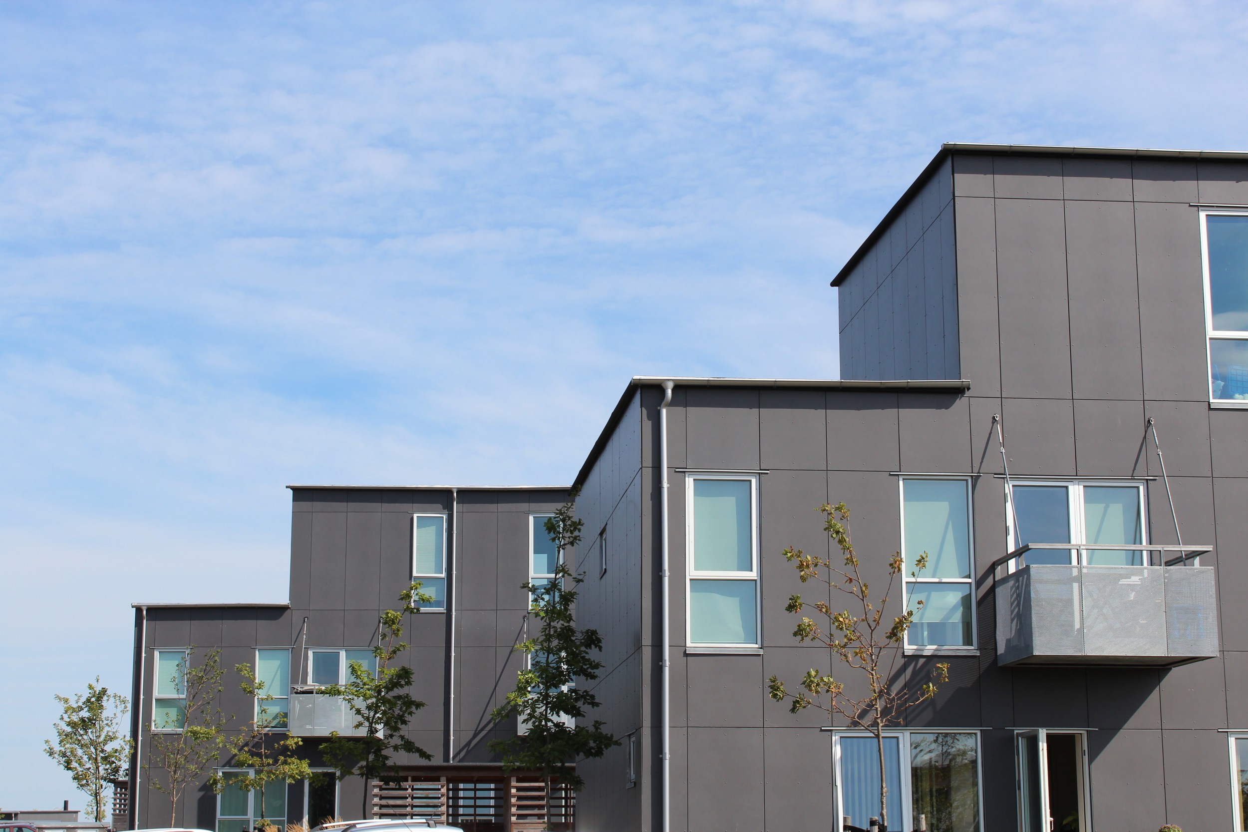 De mørkegrå facadeplader står i kontrast til de rå aluminiums vinduesrammer.