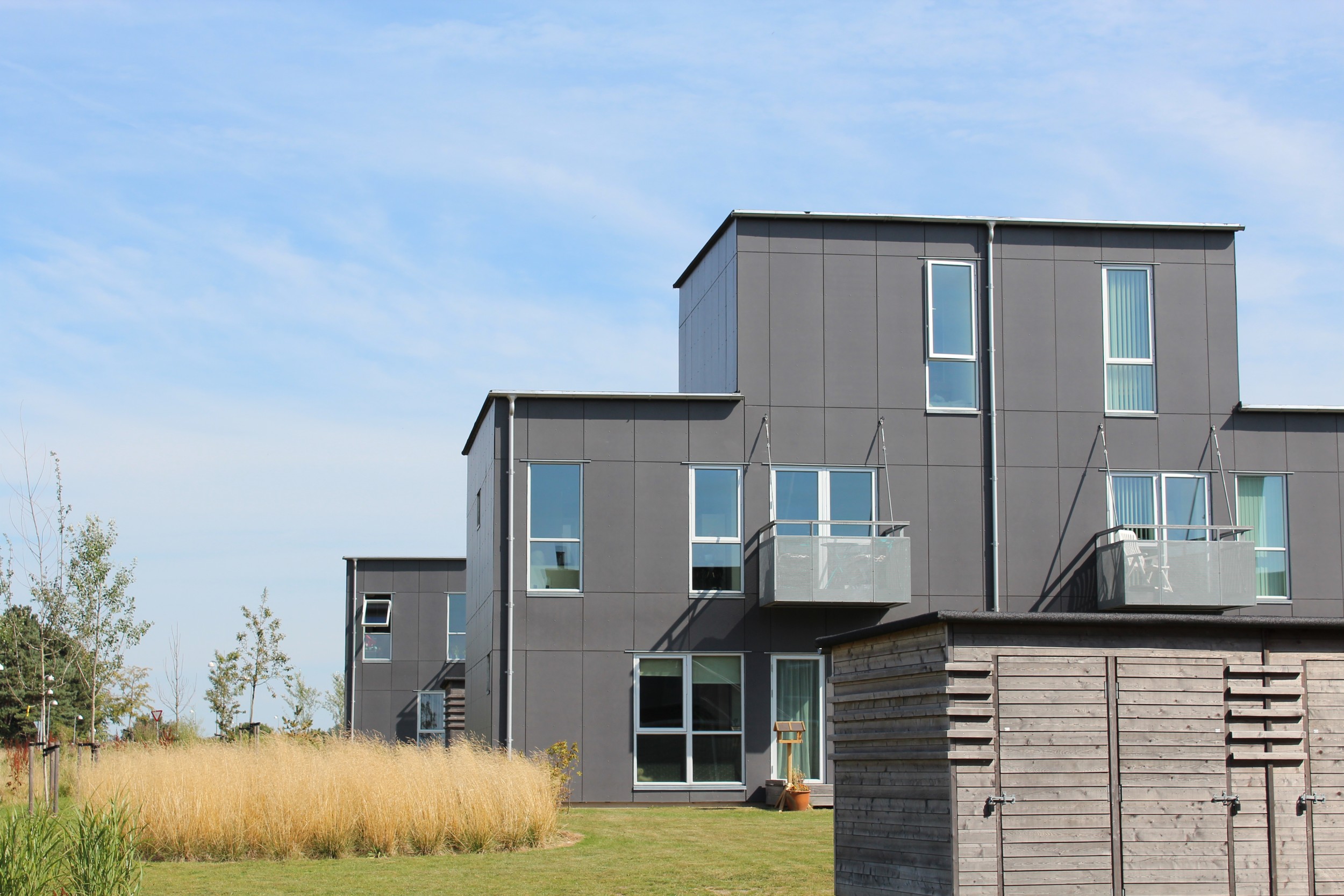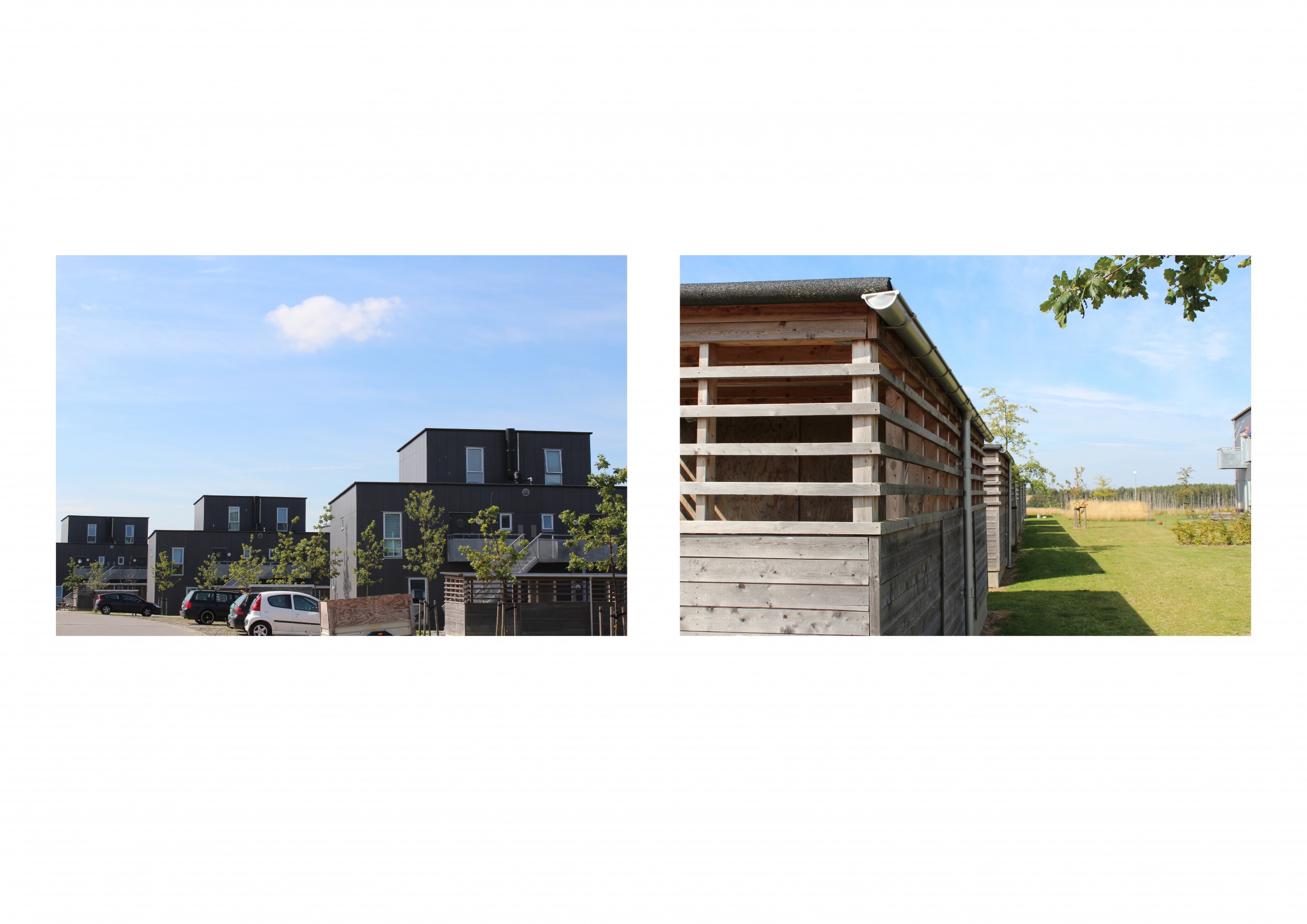 De åbne affalds- og cykelskure er udført i cedertræ og er placeret i de grønne pauser i mellem boligstokkene.